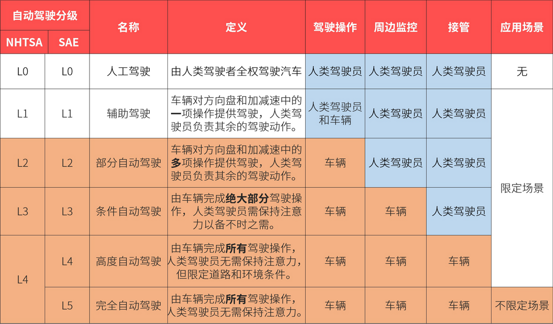 要说到自动驾驶分级,那么就不得不了解两个协会,美国高速公路安全管理局(NHTSA)和国际自动工程师学会(SAE)。这两个协会规定了自动驾驶的分级。NHTSA分为5个等级,从L0到L4,SAE的划分更细,分为6个等级,将NHTSA的L4拆分为L4和L5级。真正的自动驾驶至少要达到L4/L5级别。