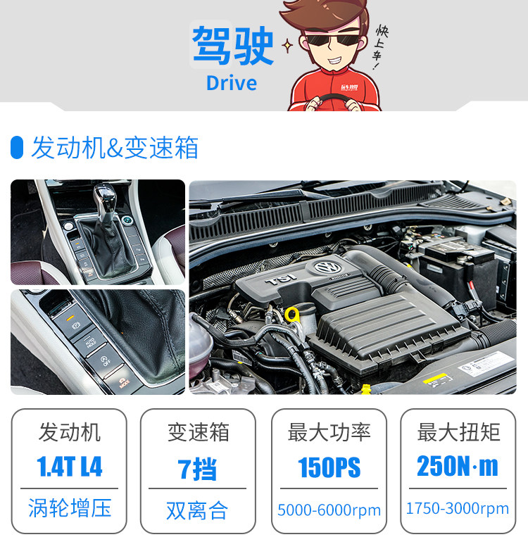 动力方面,这代车型仅提供两款发动机可以选择,分别为1.2T(116马力)和1.4T(150马力)两款,搭配7速DSG双离合变速箱,依旧是浓厚的大众式调教风格。