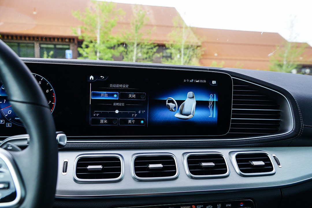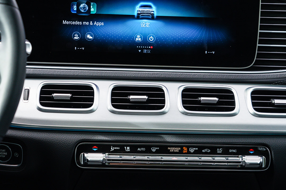 不过与S级一味强调华美有所区分,GLS在美之余也在向我们传递着“野”。我们在新世代奔驰车型上,见惯了的“燃气炉”式圆形空调出风口,来到GLS上变为了倒圆角的矩形,看来奔驰要的并不是一辆外刚内柔的GLS,他们希望向我们呈现一台里外都很硬气的科技越野座驾。