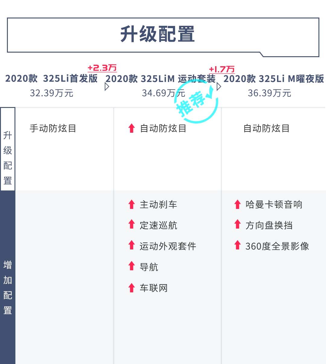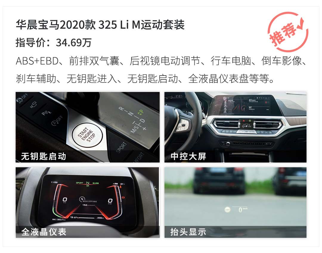 从标配和升级配置方面来看,全系标配已经非常丰富了,所以每一款车型之间的配置都相差不大,但是综合升级配置来看,教授比较推荐2020款 325Li M运动套装,性价比最高。顶配的车型多出来的配置实用性不高,没必要去买,而中配则配置足够丰富,完全够用。