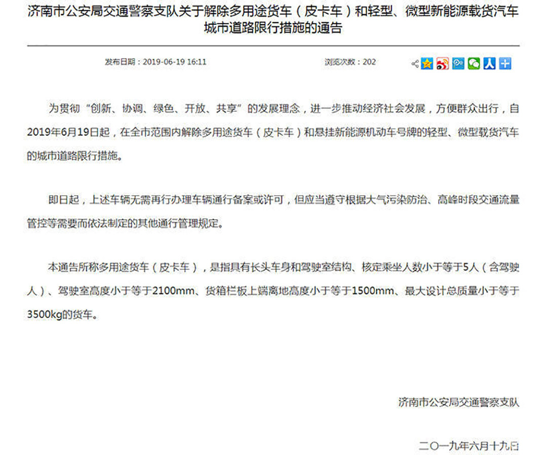 日前,山东省济南市公安局官方网站发布通告称,自2019年6月19日起,在济南市范围内解除皮卡车的城市道路限行,但应当遵守大气污染防治、高峰时段交通流量管控等需要而依法制定的其他通行管理规定。