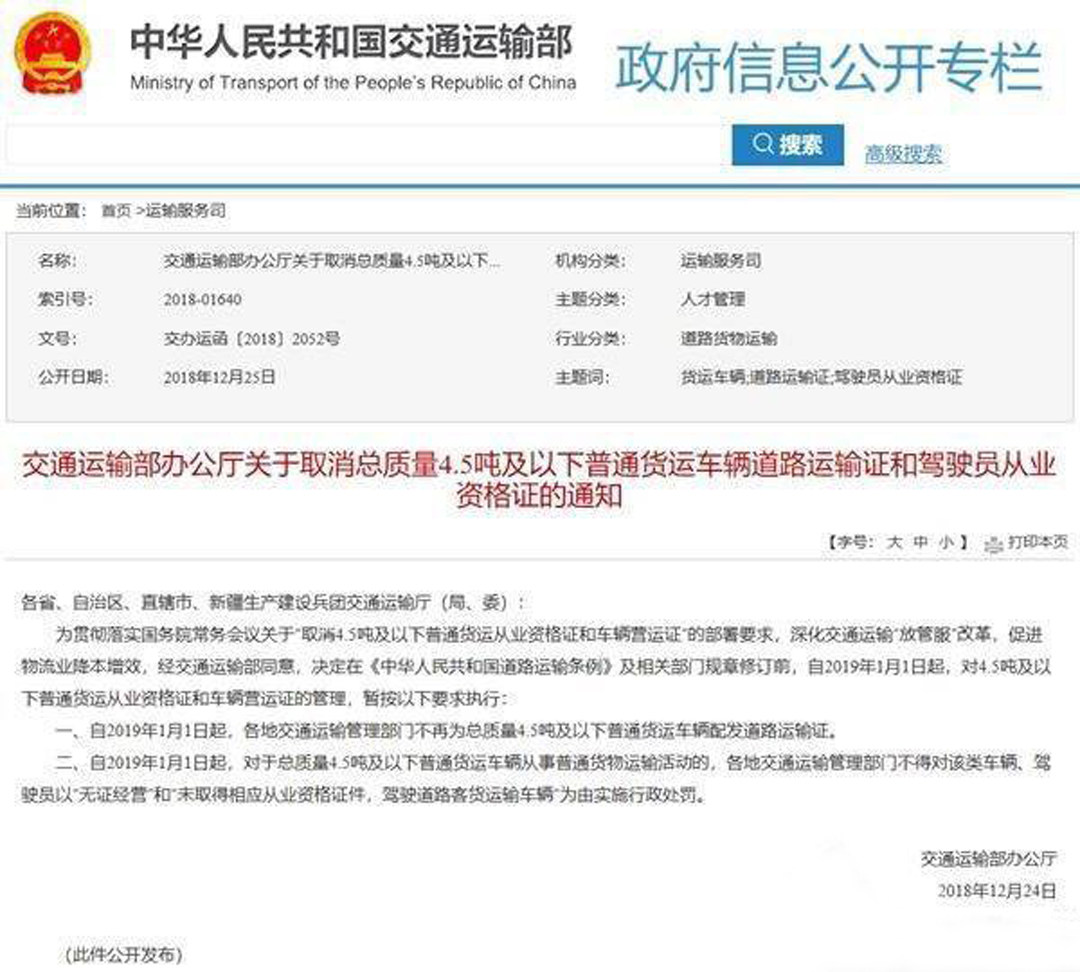 1月1日开始,交通运输部取消总质量4.5吨及以下普通货运车辆道路运输证和驾驶员从业资格证。