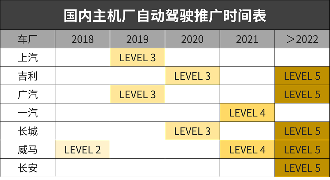 国内厂商普遍计划在2022年推出达到L4级以上的自动驾驶车辆