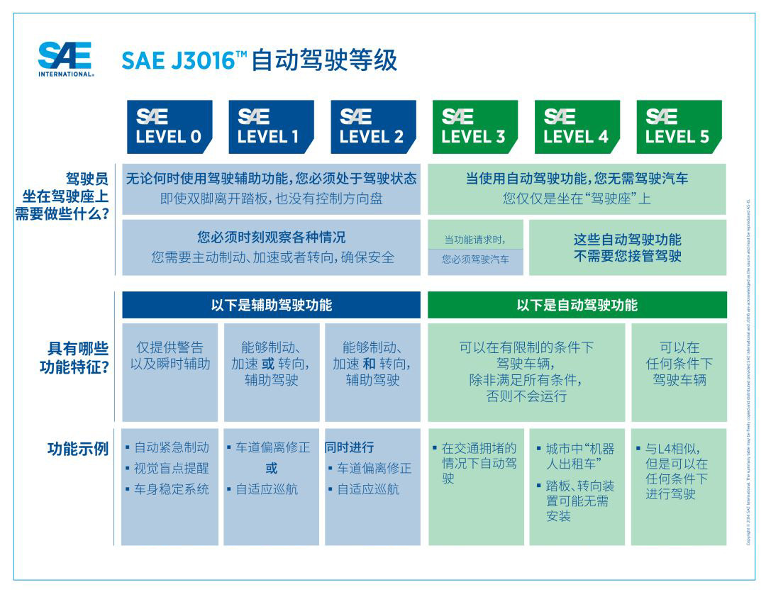 关于自动驾驶的分级,全球汽车行业公认两个组织提出的:美国高速公路安全管理局(NHTSA)和美国机动车工程师学会(SAE),在这两者中又以按SAE的分级标准居多,SAE将自动驾驶层级划分为6级。