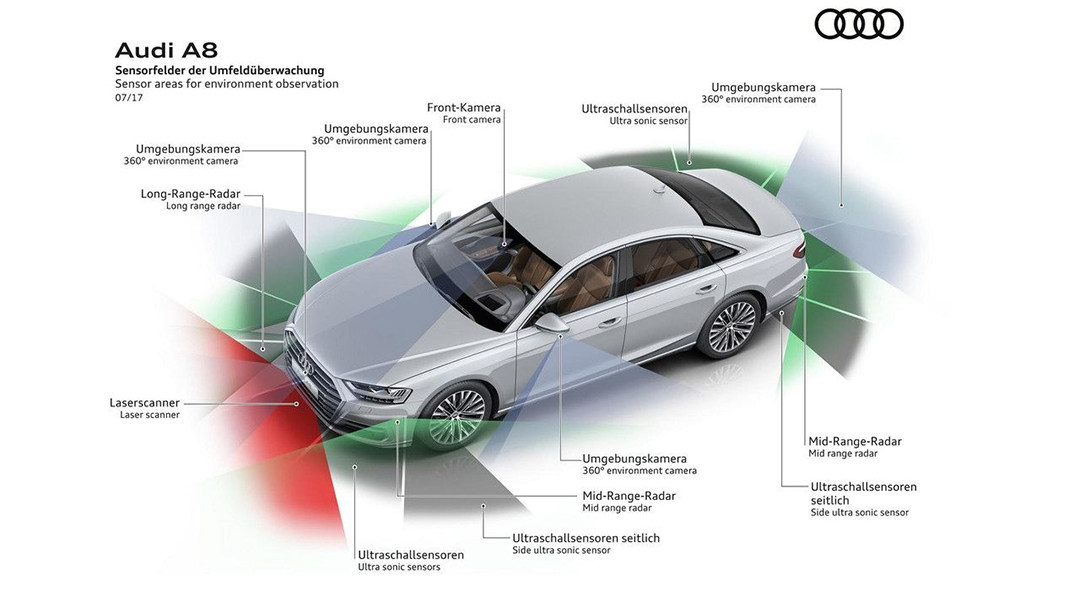 去年上市的奥迪新一代A8全车装备有12个超声传感器、4个360°影像摄像头、一个前顶置摄像头、1个红外摄像头、4个中程雷达、1个长程雷达、1个激光扫描器。通过这些可以满足“有条件的自动驾驶”,具体表现为: