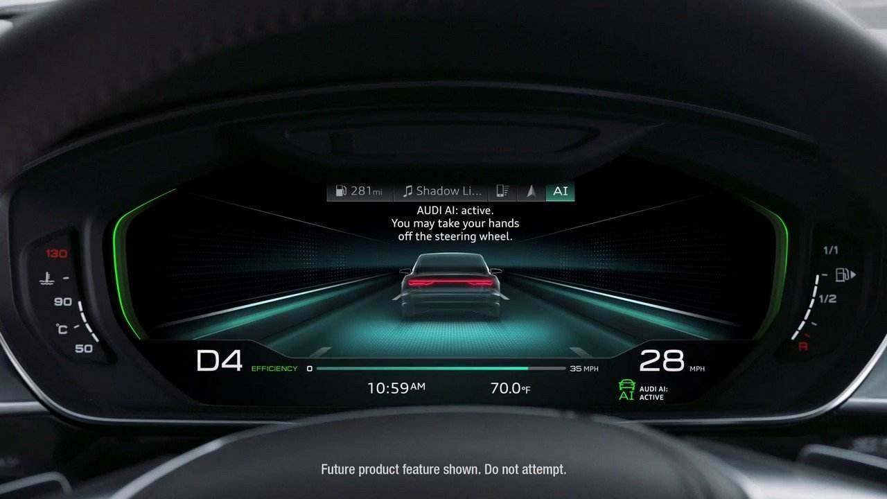 当车在有隔离带的高速公路上以不超过60km/h的速度行驶时,驾驶员按下中控台上的AI按钮,奥迪AI拥堵自动驾驶系统将接管驾驶,这时候不需要驾驶员进行任何操控,也无需将手放在方向盘上,甚至可以看报纸,只需要在A8做出提醒后接管驾驶即可。此外它还可以实现将A8停入、驶出停车位或车库,执行时无需驾驶员在车内辅助。