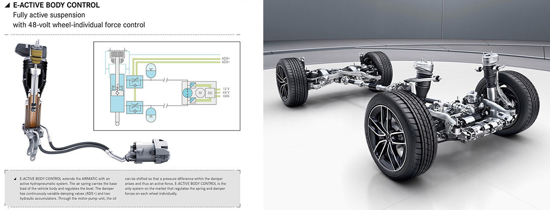 之所以会“跳舞”全赖奔驰全新的E-Active Body Control系统,该系统会因应不同的路况、车辆的当前状态对四根悬挂进行独立调节。比如在极端路面通过车身上下晃动帮助车辆脱困,又比如在起伏路段车辆会通过前方摄像头拍下的路况计算出经过这个坑的车轮、悬挂应该采取什么样的调校参数,确保车内乘员的舒适性。