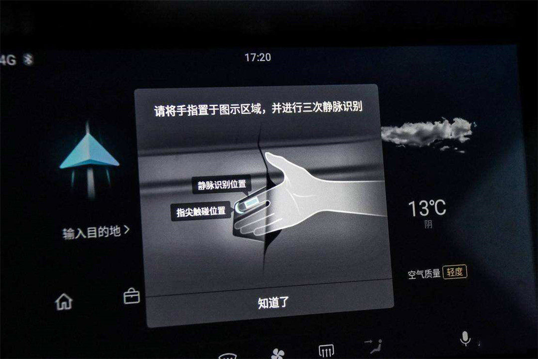 零跑的生物钥匙分为两部分,一部分是静脉识别解锁,通过传感器识别驾驶员手指的血管分布来解锁车门,复杂程度是指纹解锁的几十倍,并且静脉解锁还不受天气、温度、环境的影响,比指纹解锁有更高的安全性和识别率。