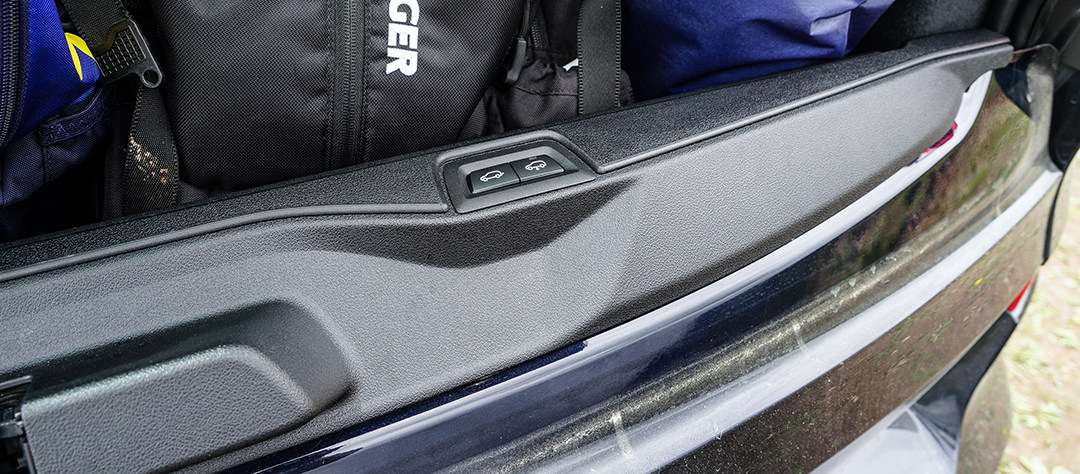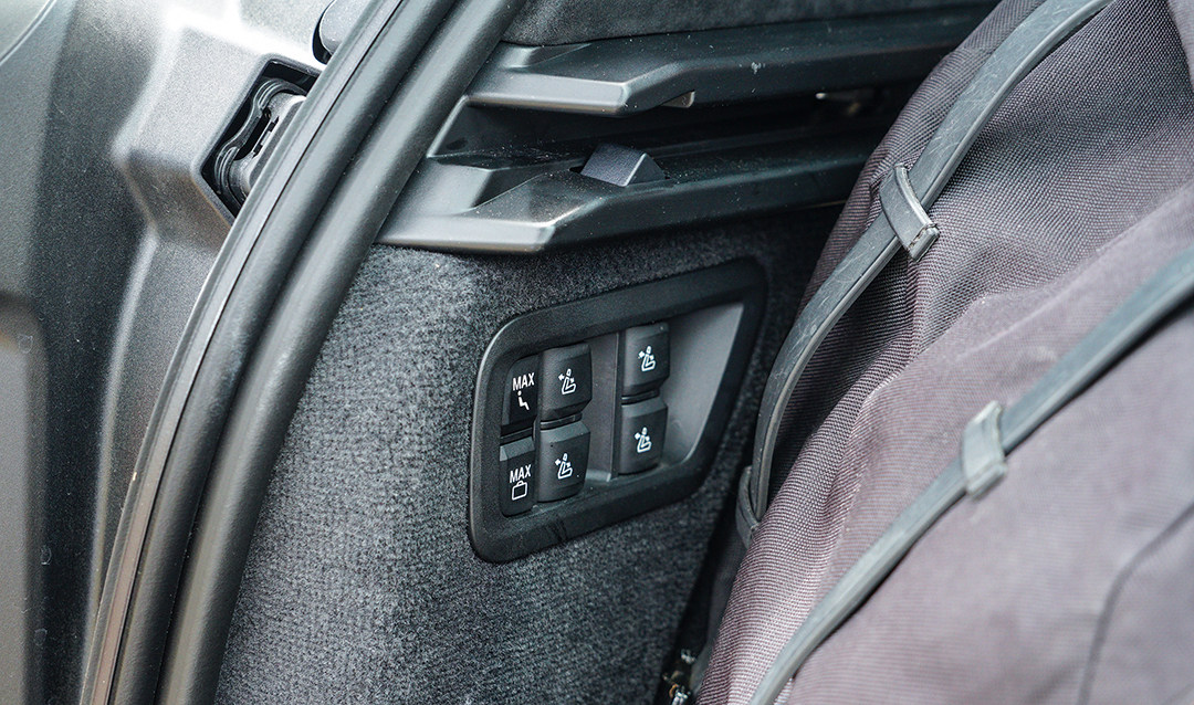 若是嫌搬放行李时不够便利,我们能够在行李厢侧边找到许多功能按键,例如前两排座椅的单独放倒、座椅全部放倒、通过控制空气悬架让行李厢离地高度下降。
