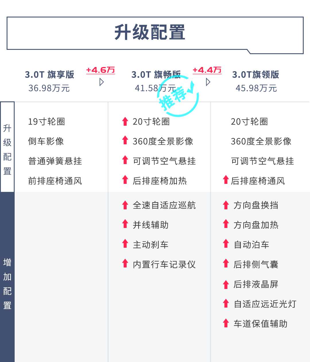 顶配旗领版则主要多出像后排液晶屏、方向盘换挡拨片、自动泊车等日常使用几率不高且略显“锦上添花”的舒适性配置,比次顶配旗畅版多花4.4万不太值。而最值得推荐的次顶配旗畅版比中配旗享版多花4.6万拥有成本不低且重要的空气悬挂和360度全景影像,比顶配旗领版省下4.4万把钱花在工作生活中更有用的地方,因而是全系的首选。