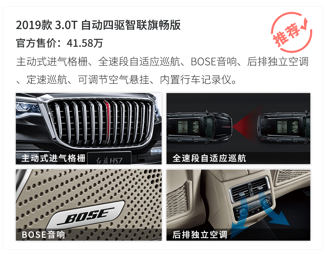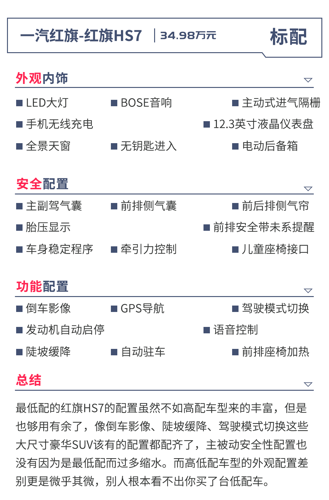 红旗HS7虽仅有4款不同配置的车型,然而不同车型间的配置差异化较为合理,不同需求的消费者总能在其中选出最适合自己的那一款,而且最低配车型的配置水平也堪称够用有余,绝对不会有“丐版”的感觉。