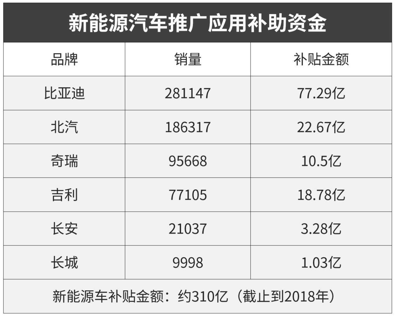 工信部审核公示显示,新能源车推广应用补助资金约310亿,比亚迪、北汽、奇瑞、吉利、长安和长城,这6家企业占补贴总额44%,如果算上地方补贴,那么这几家企业所拿到的补贴可能有两百多亿甚至以上。