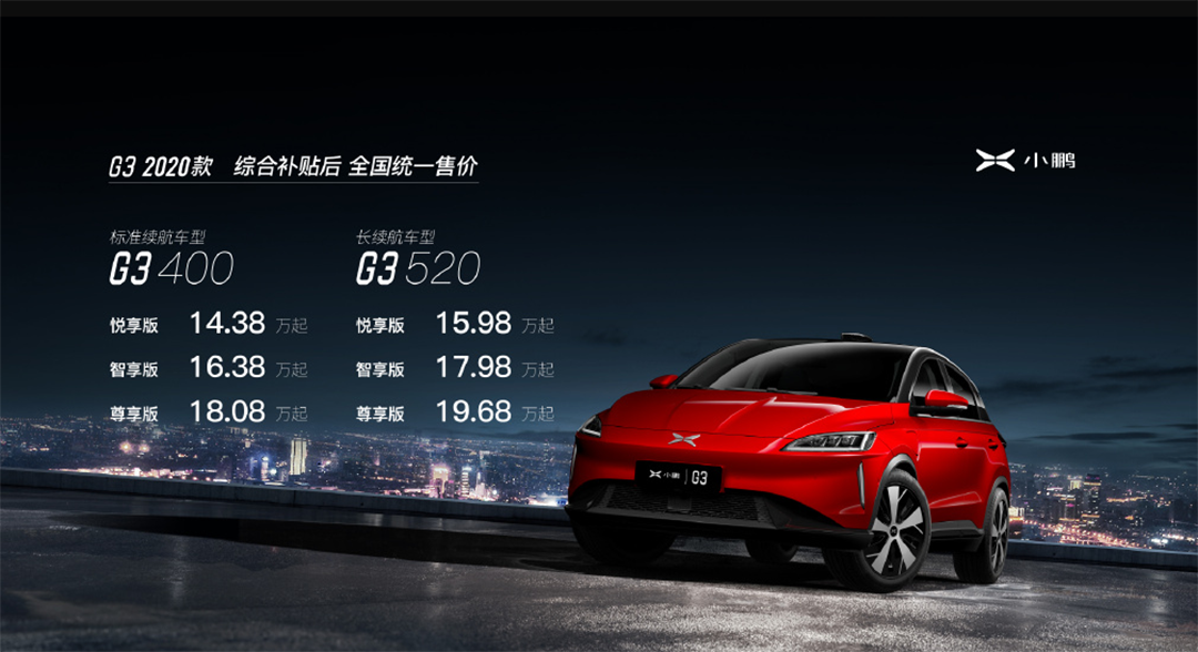 7月10号,2020款小鹏G3新款车型正式上市,共推出400标准续航跟520长续航两个版本,售价补贴后在14.38万-19.68万。