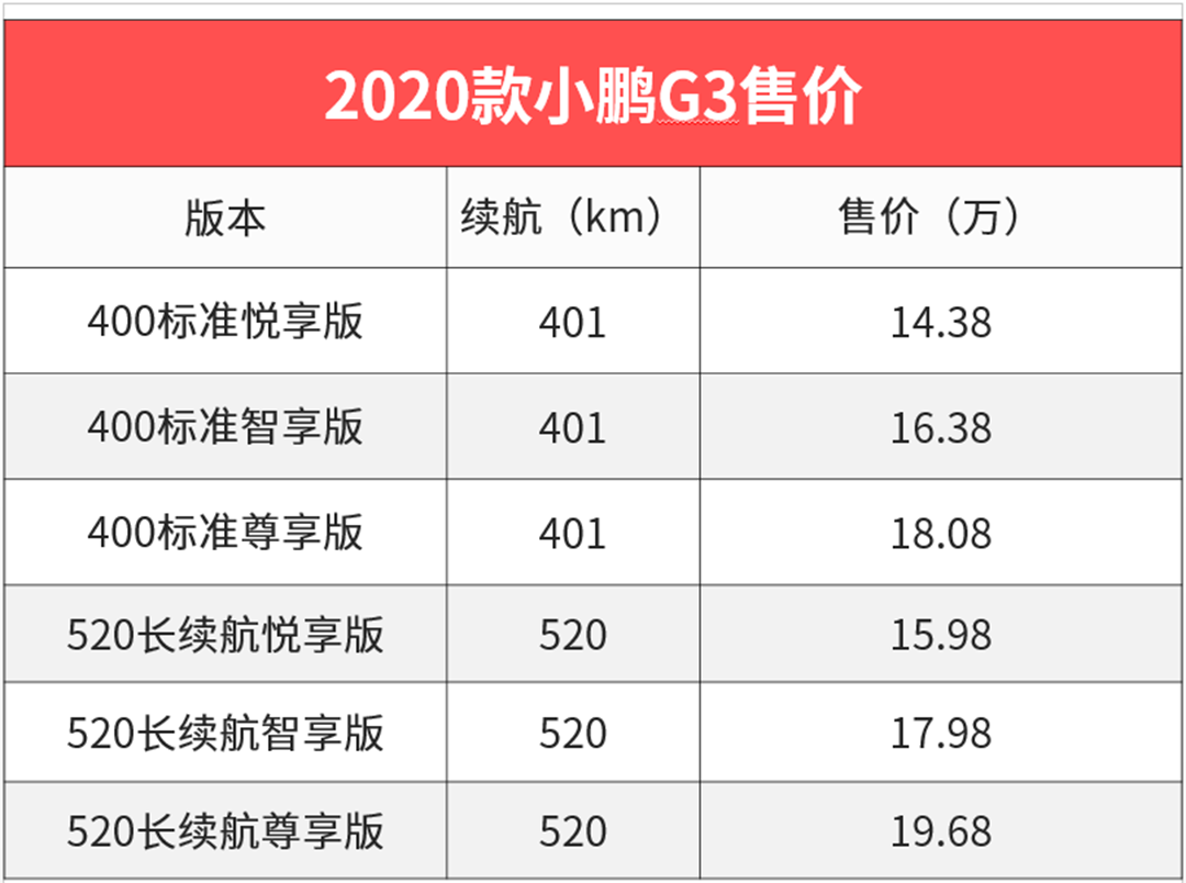 7月10日,2020款G3上市之后,花几乎差不多的钱,现在能买到的G3续航里程达到401km或者520km的版本。