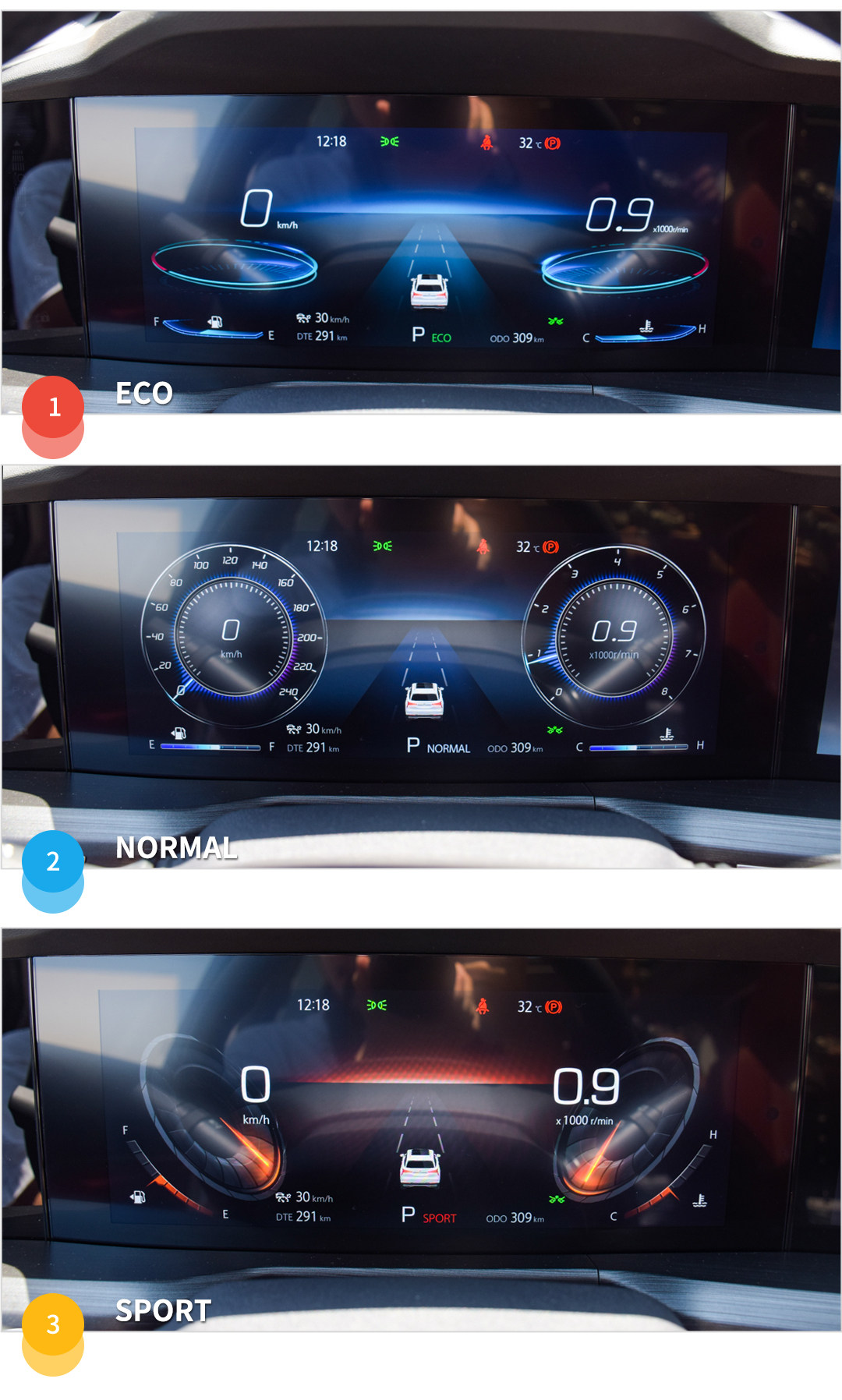 液晶仪表放置在“帽檐”下方,可以有效避免反光,实际体验下来显示效果比较出色。提供了3种不同驾驶模式下的UI画面,分别为ECO/NORMAL/SPORT,简约的设计样式看着挺舒服。