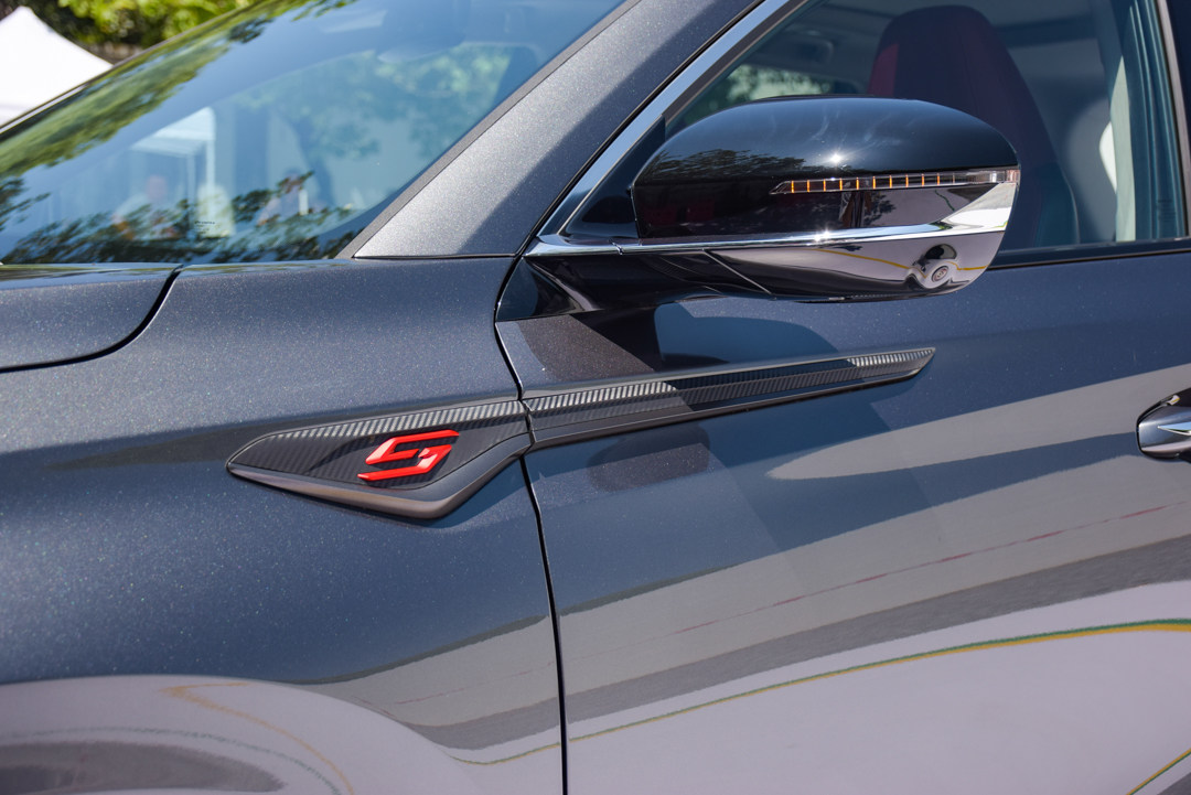 后视镜下方加入的镀铬装饰是点睛之笔,整块饰条从翼子板上方贯穿至车门,位置刚好在腰线上。