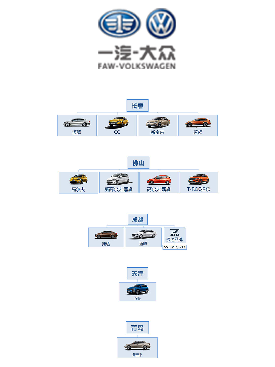 目前大众汽车在中国境内共有十一座整车厂,与上汽和一汽合资进行生产。