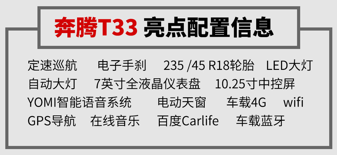 奔腾T33是为小镇务实青年而打造的车型,他们对于动力的需求并不大,但是对于后期使用成本及其敏感;对智能科技抱有极大的兴趣;审美不再会让步实用。也许奔腾T33就是他们心目中最适合的车型。接下来一切,都看8月3日上市的价格。