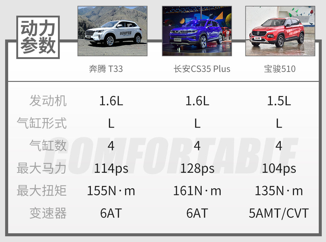 采用1.6L自然吸气发动机就没有任何好处吗?非也。奔腾T33要面对的是年轻消费者,他们对价格更加敏感,皮实耐用、后期保养费用低、省油的1.6L自然吸气发动机实属最合适的选择。市面上最热门的两款小型SUV,宝骏510和CS35 PLUS不也是用1.5L/1.6L自然吸气发动机么?
