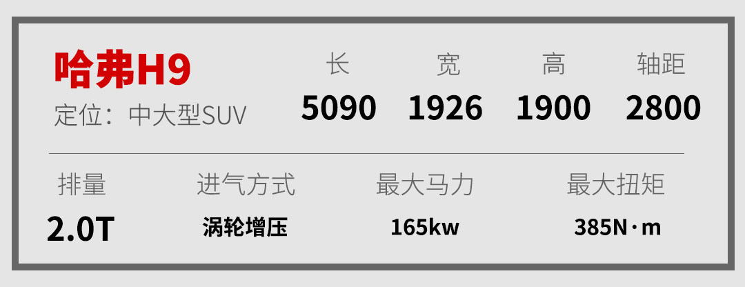 2020款哈弗H9,属于后期改款车型,毕竟这是一辆最早在2014年正式推出的车型。它定位中大型SUV,有着5090*1926*1900mm的车身尺寸,这般魁梧的身材能让那些车主享受到不一样的目光待遇。