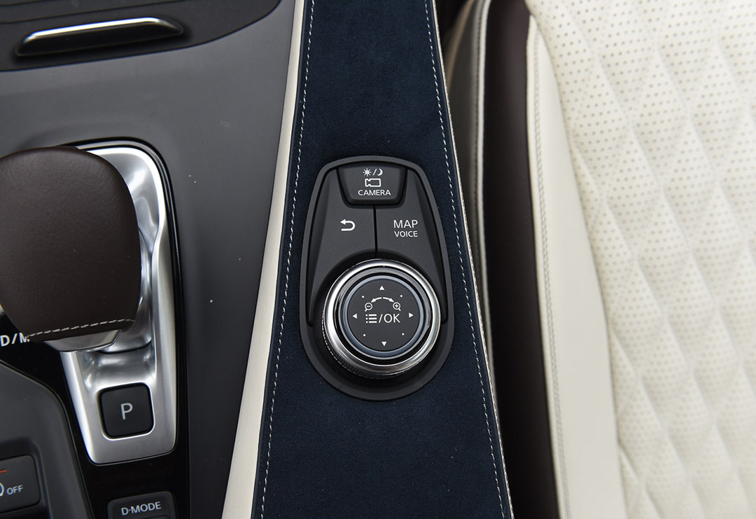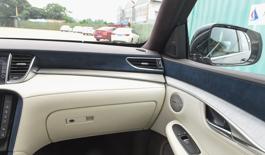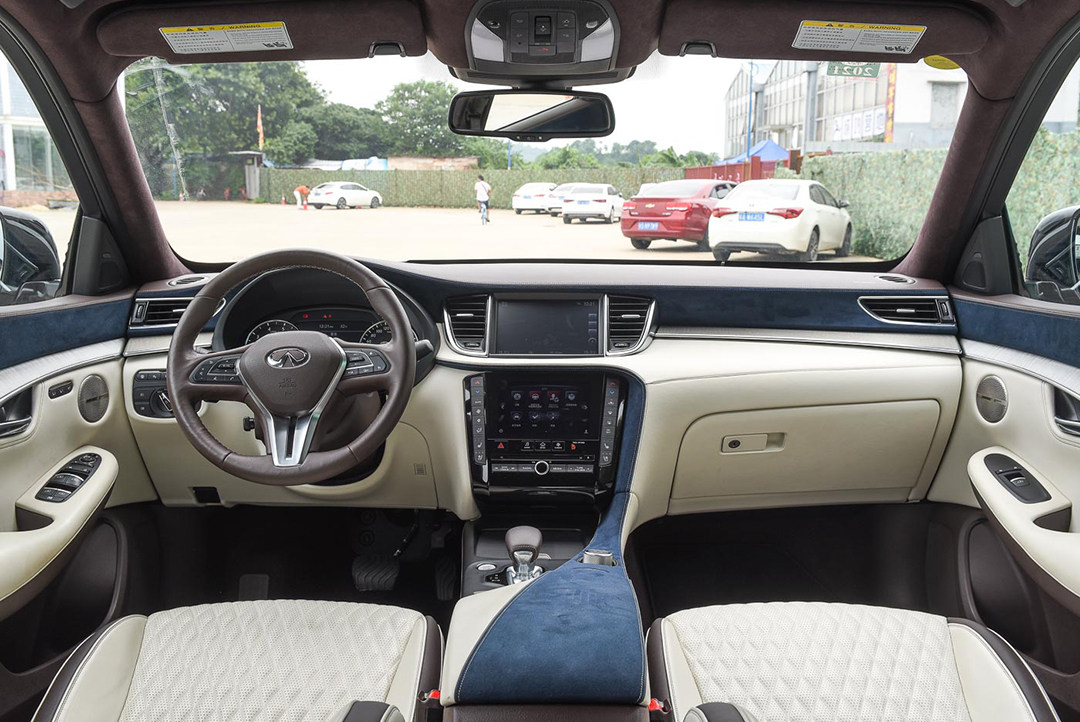 眼下这款QX50是选装了圣托里尼内饰套装的版本,以1.9万人民币,换来的是整个车厢内豪华质感的凸显,大面积覆盖的手工缝制蓝色麂皮、枫木饰板、菱格纹缝线真皮座椅、Ultrasuede麂皮顶棚内衬。