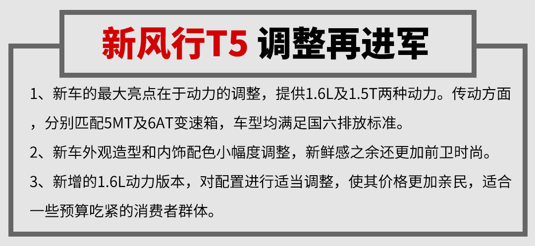 原先教授就试驾过风行T5,只不过是之前的1.6T版本,匹配7速双离合变速箱,整体的驾驶感受并不能让挑剔的教授满意。而时下,新风行T5在动力上提供了1.6L和1.5T两款引擎,两者在传动方面,分别匹配了5MT和6AT变速箱。