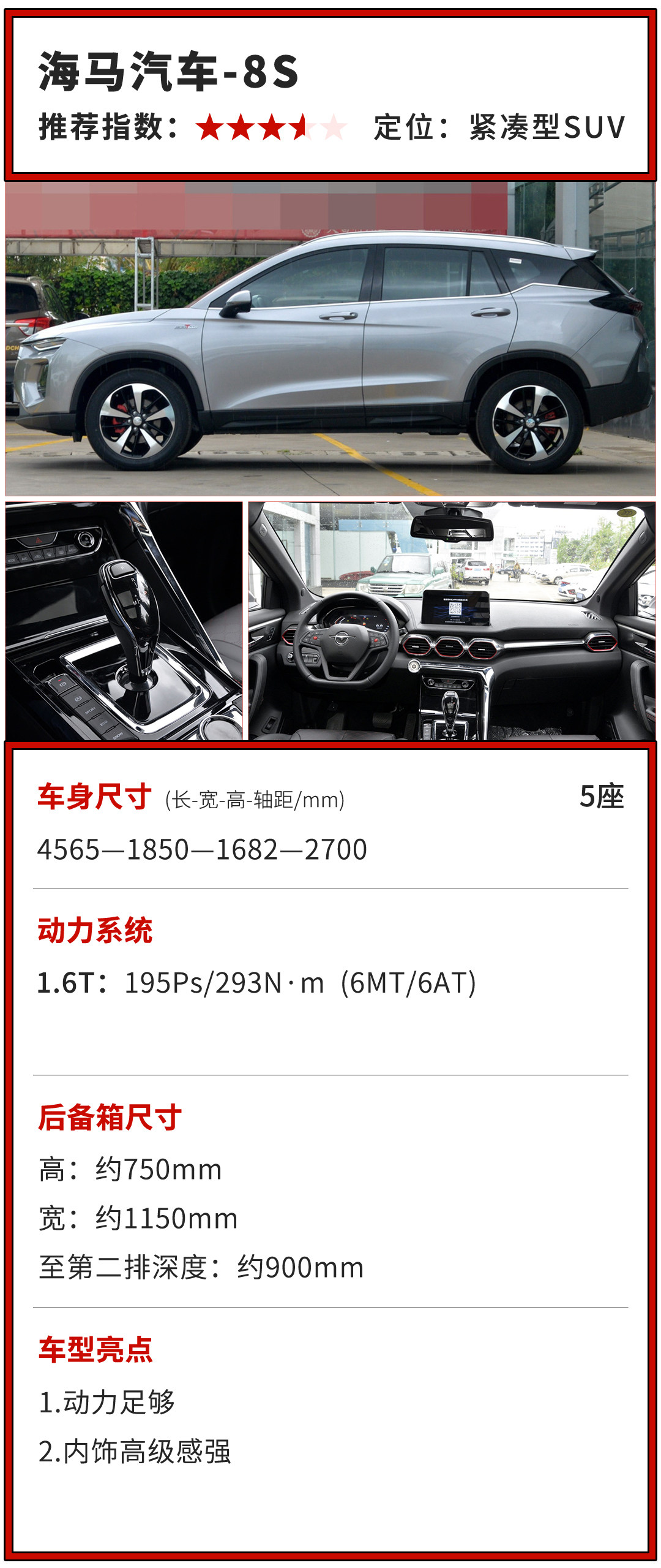 最后一位则是来自海马汽车的翻身之作——8S,从目前的情况来看,8S基本能体现出海马汽车的用心和诚意,无论是外观、内饰、配置还是动力都做得令人满意。并且在细节上也做了很多自主品牌会忽略的改进,这些都让教授对它在市场的表现感到期待。