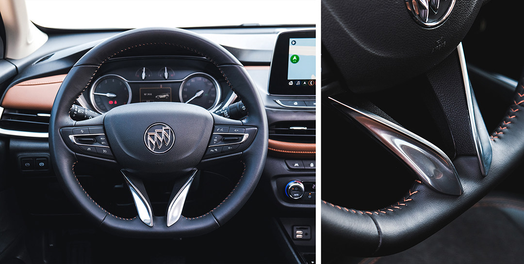 新一代昂科拉采用了运动性取向的平底方向盘,在方向盘样式设计方面,这一个新款方向盘是当前别克家族中颜值最高之一;相比于旧款昂科拉使用的那个尺寸大且略显老气的方向盘,新一代昂科拉的方向盘更加时尚、精致。