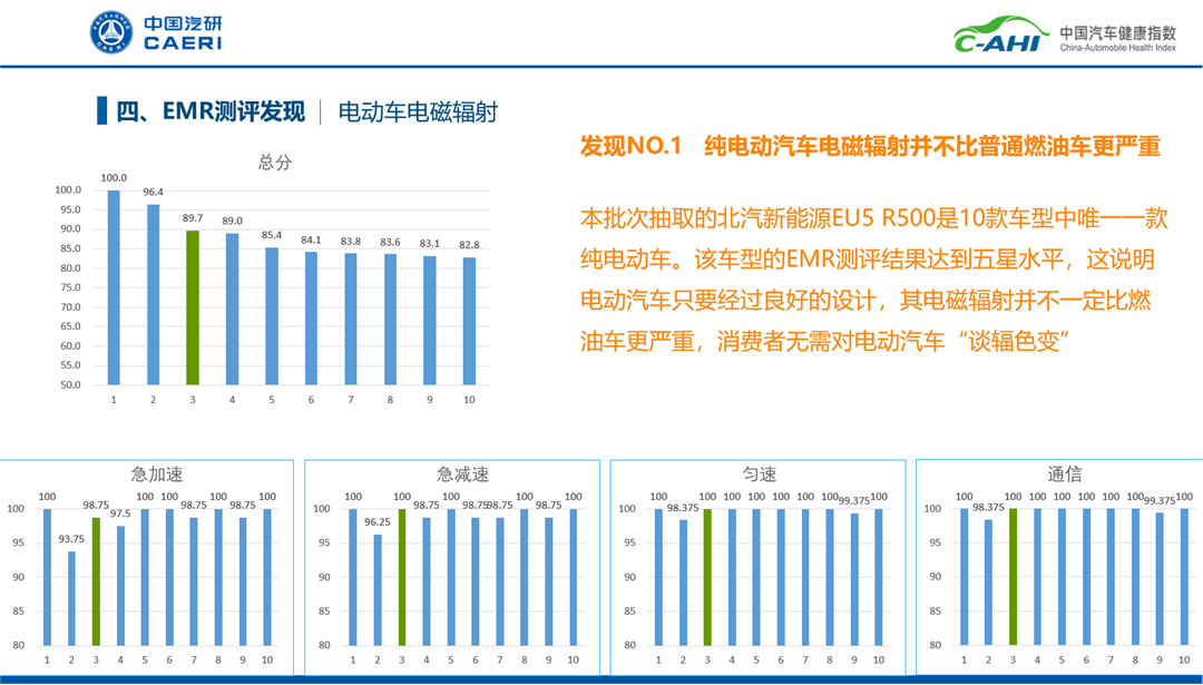 中国汽车健康指数以国际交通医学会为主导,整合汽车、医疗、通信行业技术资源。针对车内挥发性有机物(VOC)、车内气味强度(VOI),以及车辆电磁辐射(EMR)三大维度来衡定车辆的健康指数,而车内颗粒物(PM)、车内致敏风险(VAR)两大测评项目也会加入到下一阶段的测评中。在本次测试中有关车载大屏辐射对身体有害、座椅加热辐射超标、急加减速状态下车内低频磁场高于匀速等多个消费者关注度较高的车内安全问题一一给出了官方解答。