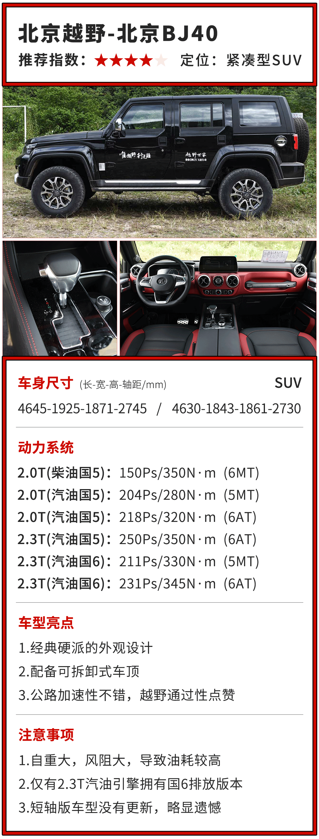 简而言之,BJ40这款车纵使有着非常不错的越野通过性和改装升级潜力,但看完教授的介绍和分析后,相信多数人还是感觉它更适合在城市里面开,越野性能只是锦上添花的属性。没错,就像教授在文中所说,很多购买BJ40的人主要还是看中它硬派经典的外观,他们通常有着一个硬派越野梦,不甘于选择那些软绵绵的城市SUV,可买牧马人又不够钱,这时BJ40就是很不错的圆梦选择。如果您也是这样,那么别等了,BJ40就是你的菜!