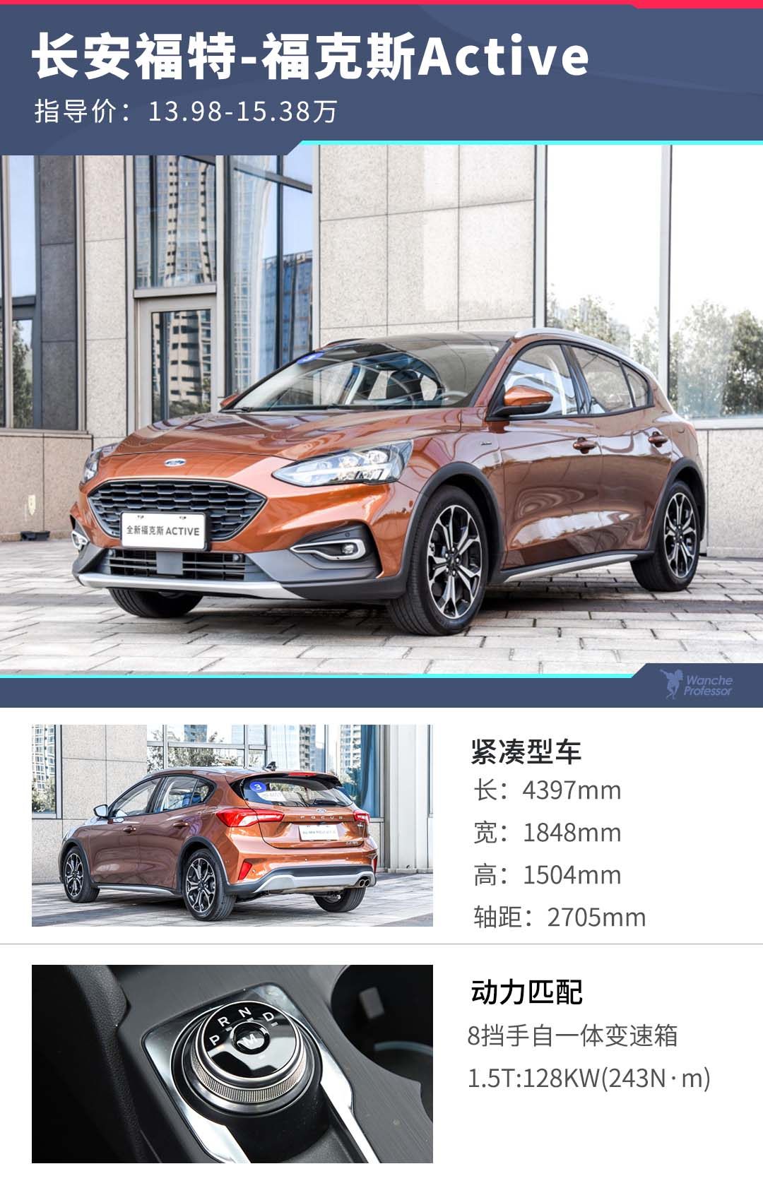 如今,一向以操控著称的福克斯也做起了SUV。8月16日,长安福特福克斯Active正式上市,售价13.98-15.38万元。新车基于福克斯两厢版车型打造,定位跨界SUV,共推出2款车型,全系搭载1.5T三缸发动机匹配8AT变速箱,配有五种驾驶模式。