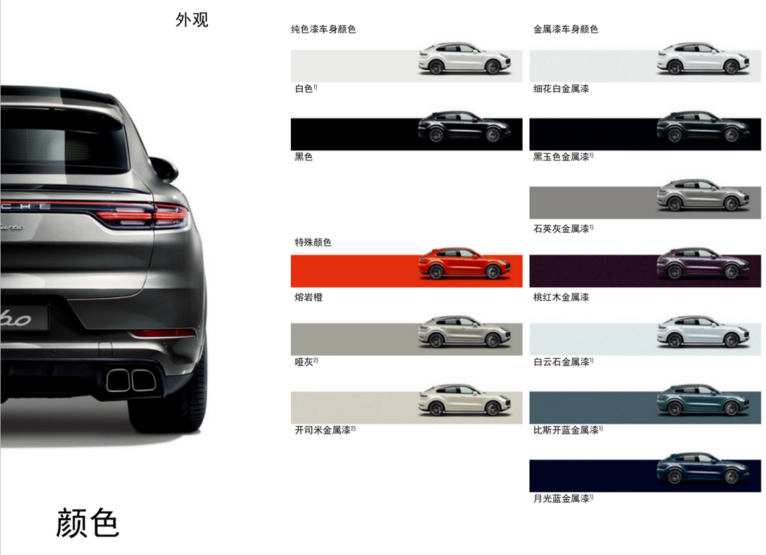 Cayenne Coupé拥有11种车身颜色,13种内饰颜色材质、17种轮圈以及多达160中的选装件供消费者选择。目前,Cayenne Coupé可以在不重样的情况下,提供超过35000台车辆。