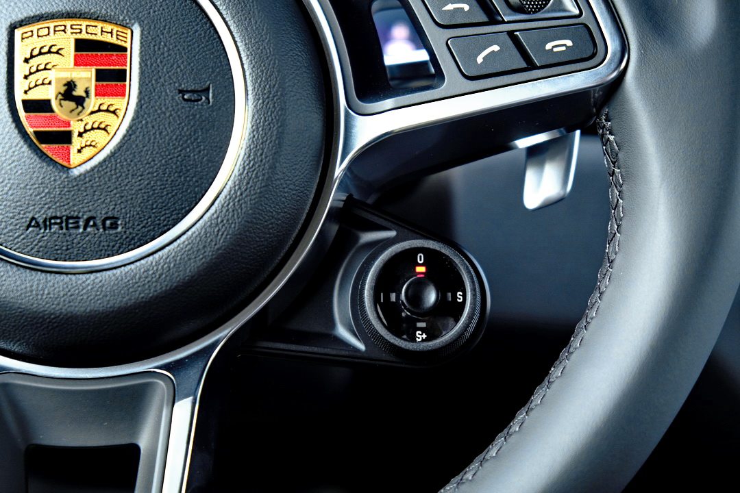 他是对的。找到方向盘右下方的Sport Chrono拨盘,转180度,此时Cayenne Coupé的性格也会转变180度,从Normal变为SPORT PLUS模式。