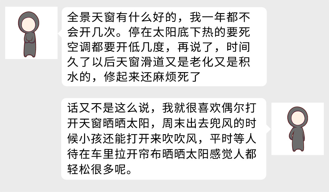 确实,天窗后期的维护会是一个比较麻烦的项目,对于不常出外游玩的车主来说一年下来开启的次数更是屈指可数,所以教授更推荐封闭式的全景天窗,在拥有足够开扬感的同时也省去了很多后期维护的麻烦,而喜欢打开天窗“放飞自我”的车主自然就选择可开式天窗最好啦~