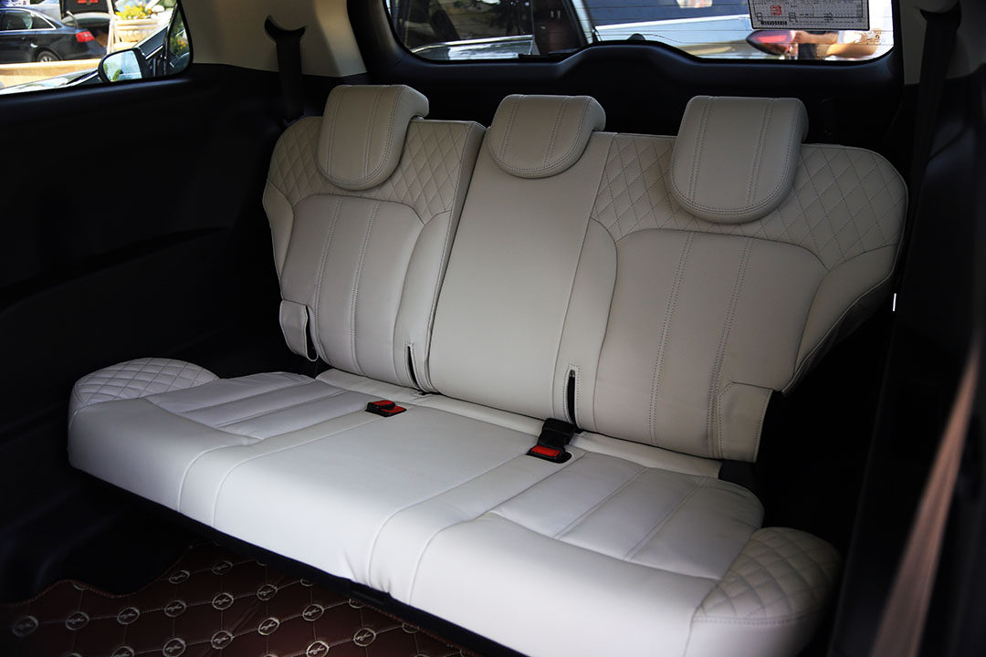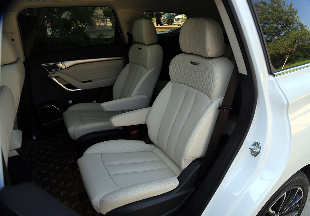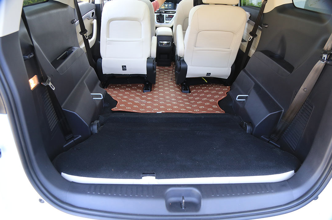 第三排座椅可轻松坐下三名身高180cm的乘客,与其他品牌第三排座椅放倒方式不同,汉腾V7第三排不仅支持4/6比例放倒,更可以完全收放至后备箱内,形成一个纯平的后备箱空间,进一步拓展了车内使用空间,完全满足家庭用车的空间需求。