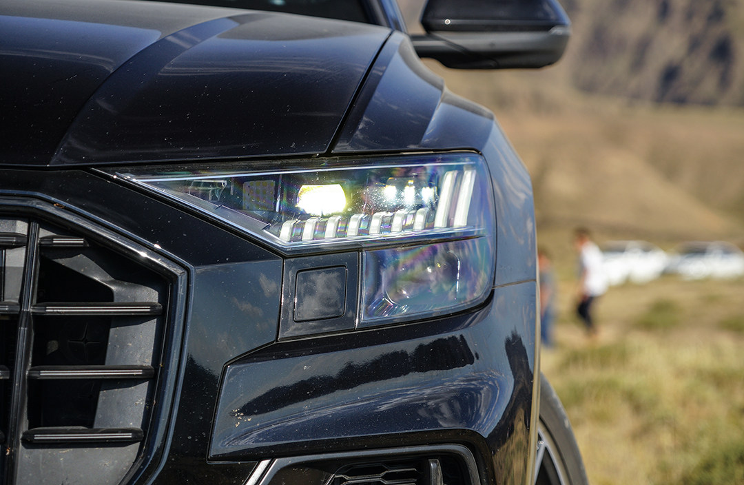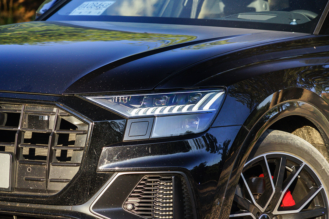 在Q8上,我们能看见许多崭新的,以往未在别的奥迪车款上见到的设计。例如拥有新造型的矩阵式LED大灯,它由两部分组成,上部集成的是日行灯、近光灯、转向灯,而远光灯位于下部,颜色深、位置靠后。所以从远处观看,大灯给人的视觉效果是偏扁平化的。