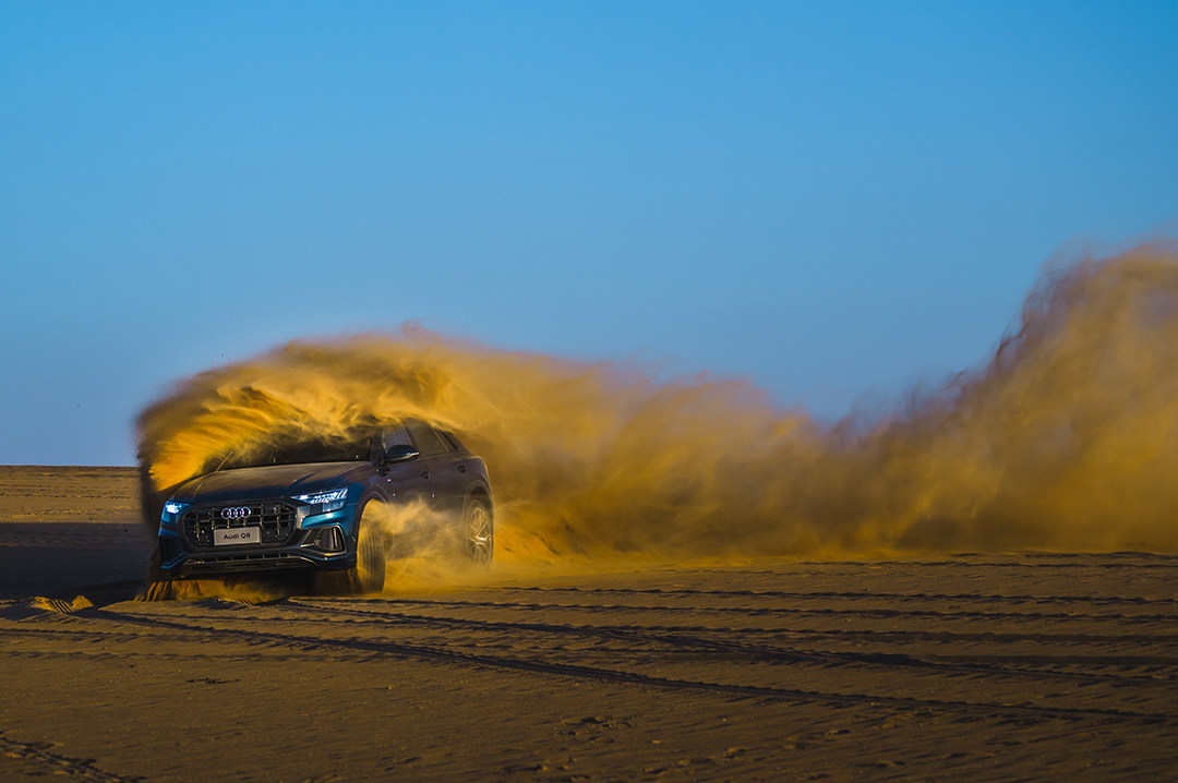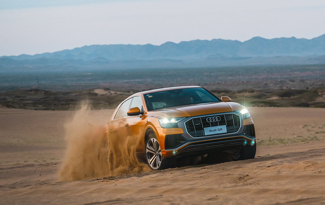 所以,奥迪有底气在不需要更换越野胎的情况下,把我们一行人拉进了沙漠撒欢。Q8并不如其长相那般,是个纯粹的公路生物,沙漠中的表现让我感到吃惊,除了注意那些个缓给油、轻打转向、轻制动的技巧外,车辆本身过硬的素质是避免让我陷入窘境的最重要原因。