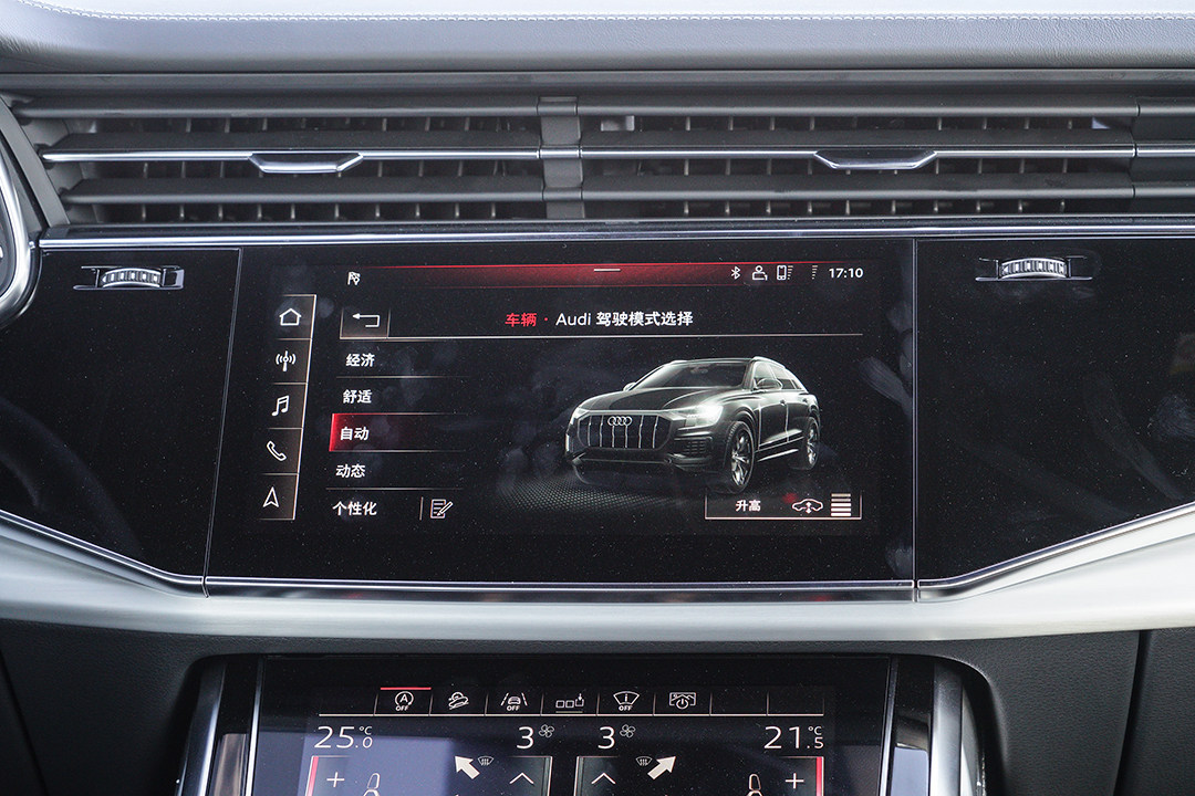 自带的多达7种驾驶模式中,除了自动、全路况模式,Q8还有越野模式,空气悬架上下高度共5级可调,最多时能为车辆带来90mm的高度改变,你所认知的“轿跑SUV”里,应该还没这么硬核的吧?