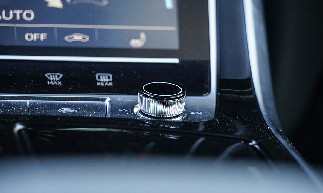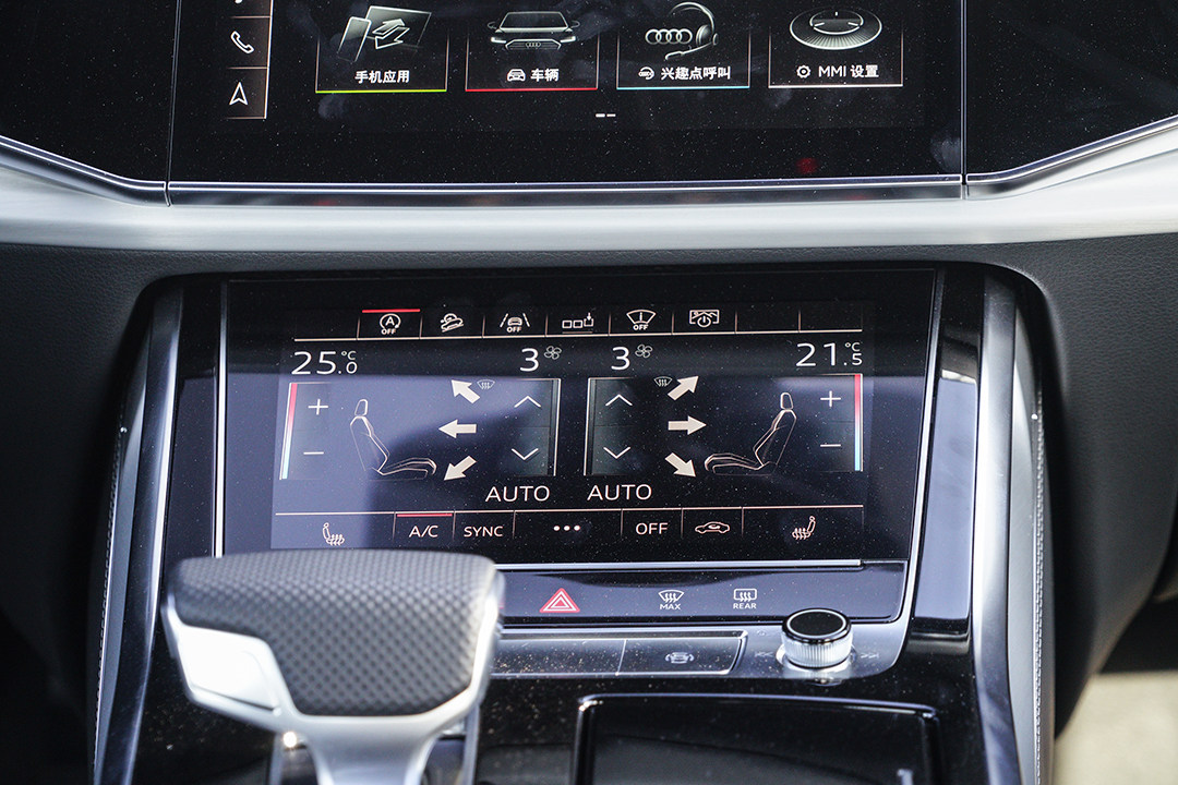关于数字化智能交互,Q8的操作理念透露了旗舰产品的果敢创新,那就是几乎不使用任何按键或旋钮。所以,中控部分由10.1英寸+8.6英寸两个高清触摸屏组成,只保留了少数的功能按键以及一个音量旋钮。