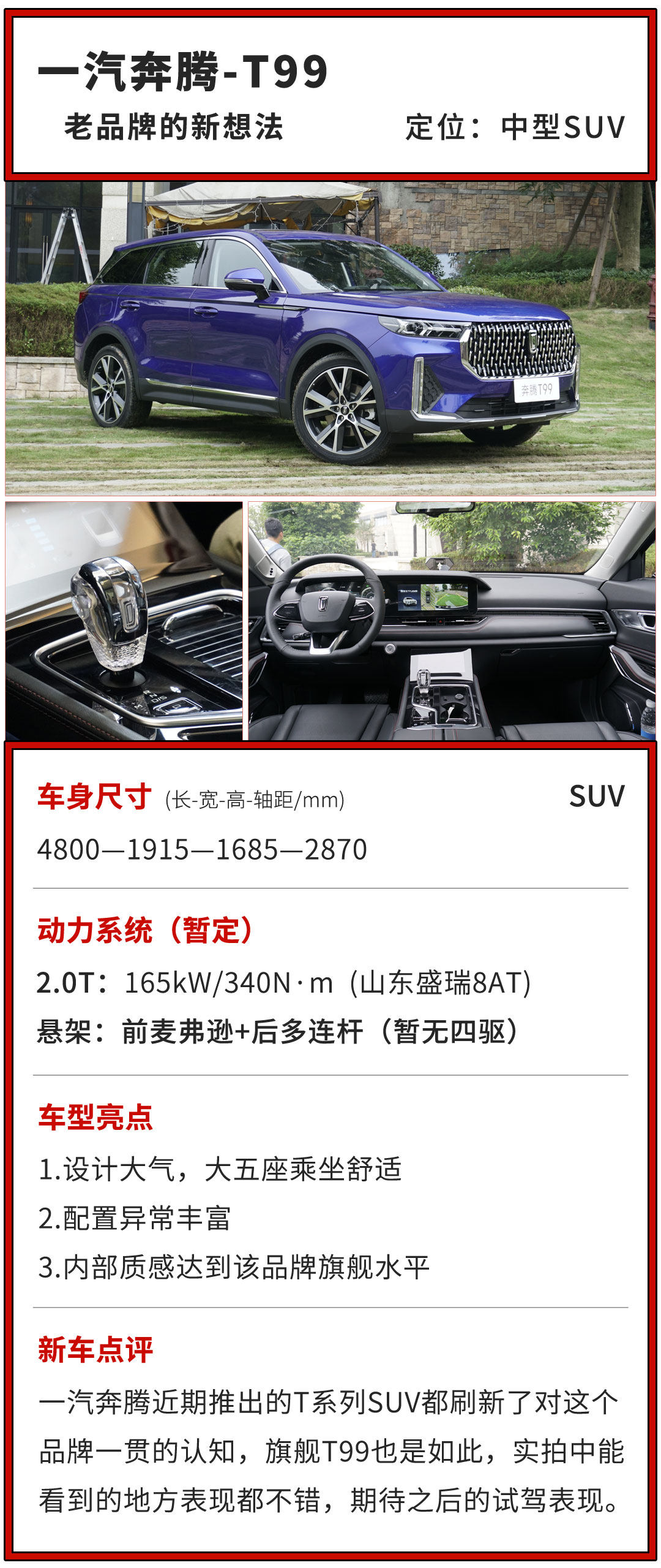 T99这款车,在动力总成上已经是拿出一汽系自主核心产品,虽然目前配备的变速箱还有提升的空间,但最终表现还是要结合定价和试驾表现多方面考量。至少从目前摆出来的实车来看,整体的完成度已经完全满足10月上市要求了。