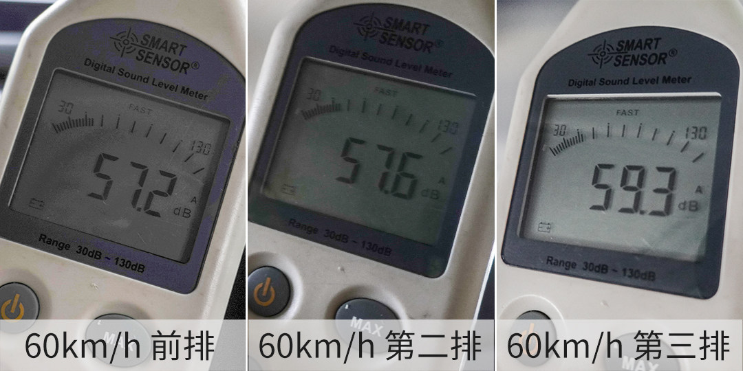 在不少人的认知里,MPV这种比较像个“箱子”的车身形态非常容易共振,所以我们刻意找到一个限定的路段,在保持60km/h的速度平稳行驶的状况下分别测得的前排、第二排和第三排的噪声(仅供参考),然而艾力绅锐•混动的表现却是出乎意料的优秀。