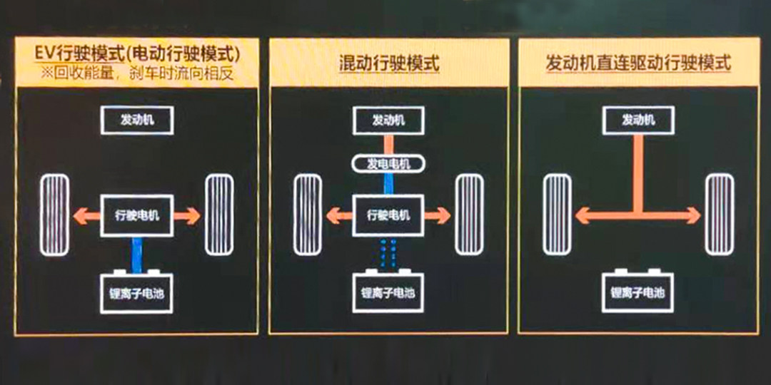 出于一些不可名状的原因,第三代i-MMD混动系统并不支持发动机与电动机共同驱动车辆行驶的功能,简单来说它的工作模式主要是三种:
