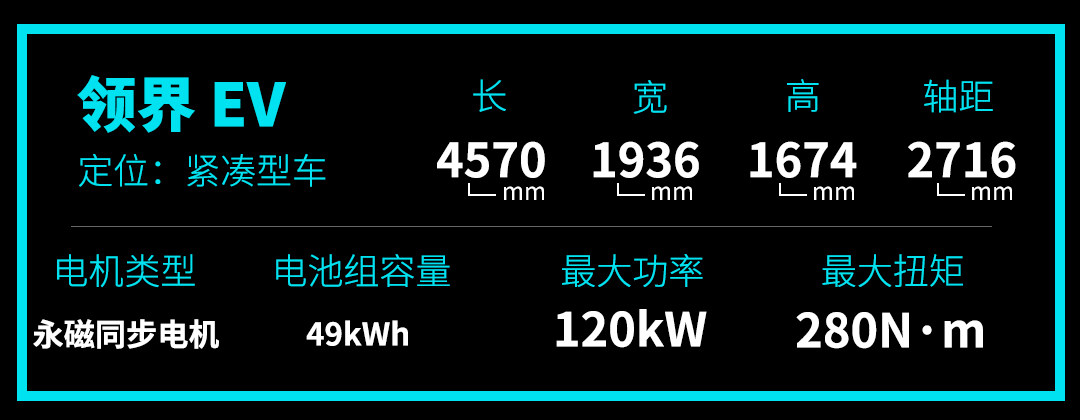 作为一台纯电动紧凑型SUV,领界EV搭载了一台永磁同步电机,最大功率为120kW,峰值扭矩为280N·m,匹配一台单速变速箱。电池组容量为49kWh,提供NEDC最大续航里程为360km。快充模式下,0.7h充满,而慢充模式下则需要6.8h。