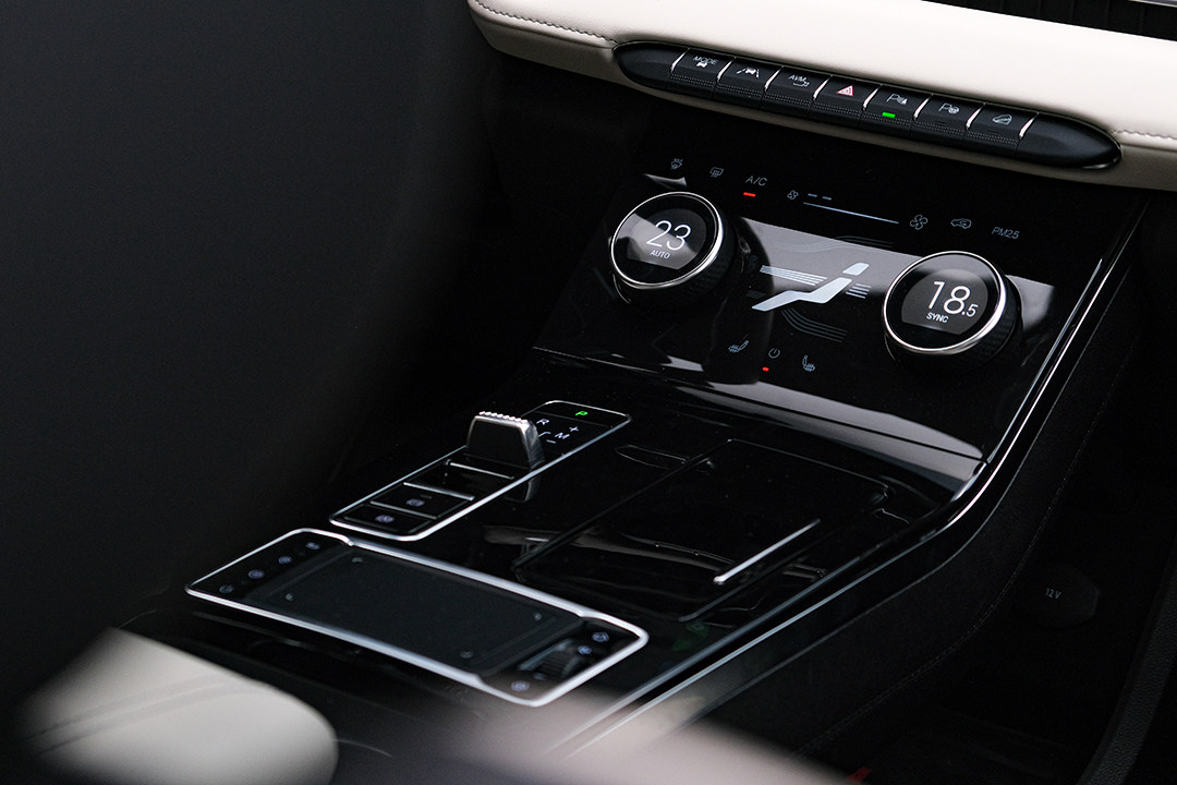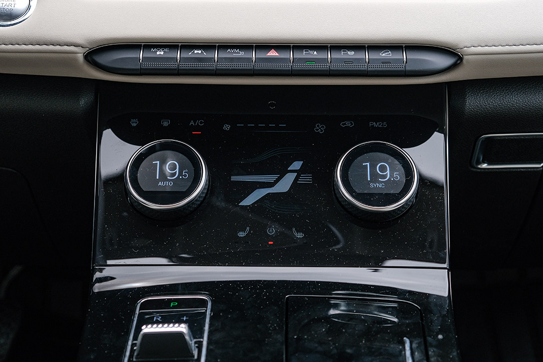 空调控制器跟路虎捷豹的车型有“异曲同工之妙”,是一款全触控的面板,外加两个旋钮,虽然也是指纹采集器,看起来是真的上档次。