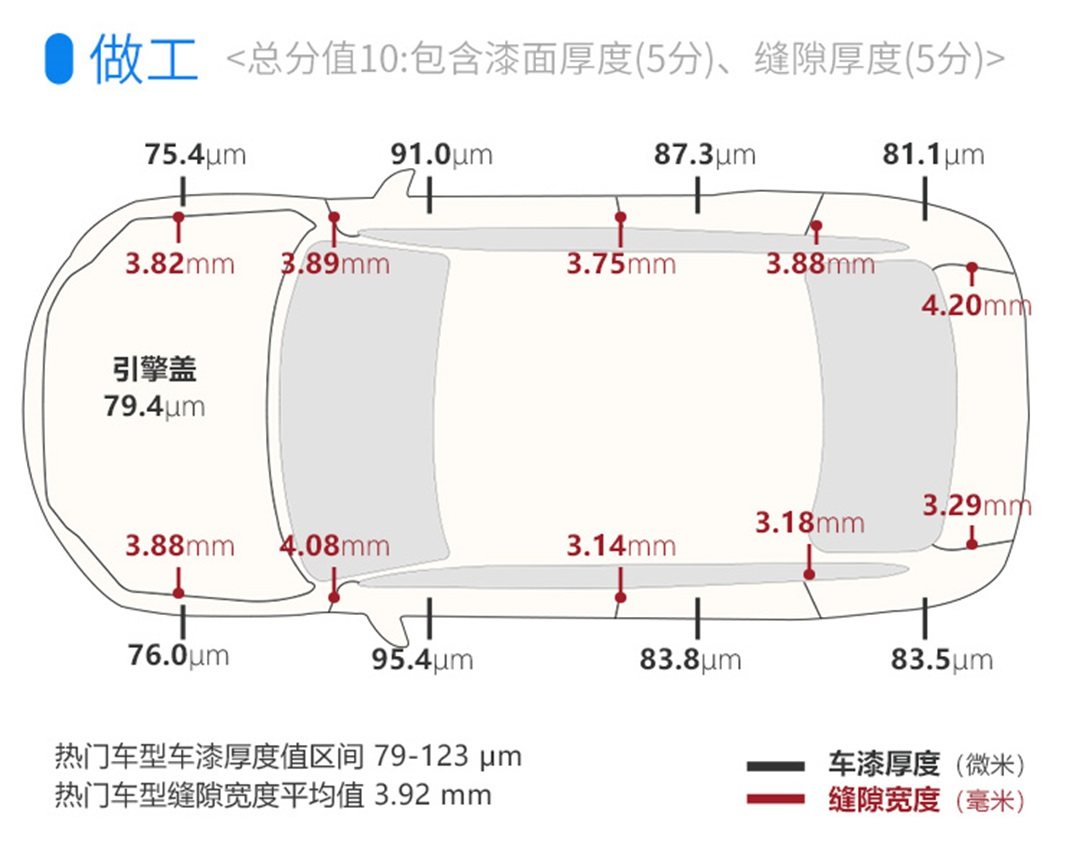 二是车辆整体装配工艺还有待提升,主要体现在车辆部件接合缝隙宽度数值波动幅度较大,以及车身漆面厚度测量数值幅度较大,很多国产车型行驶时内饰等方面存在异响,都能看出其装配工艺水准还不到位。
