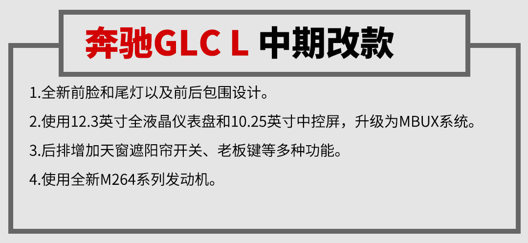 因此在去年十月份奔驰正式推出了GLC的加长轴距版本GLC L,而就在今年8月底,GLC L正式迎来了中期改款,这一次中期改款GLC L主要进行了外观内饰后排以及动力系统四个方面的升级,因此这一次我们也从这四个方面讲起。