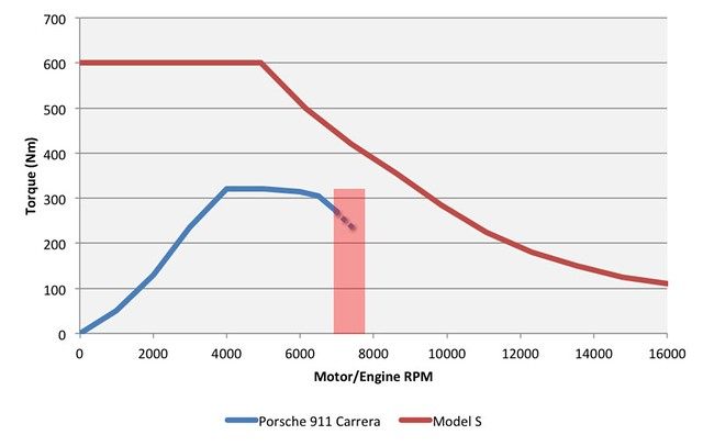 特斯拉Model S高性能版,扭矩轻松到达600N·m,而且最大扭矩在电机转动瞬间就能输出。更有意思的是,电机的扭矩随着转速增加会逐渐降低,通过控制电流和电压,电机可以贴着轮胎最大牵引力跑,因此不需要变速箱。