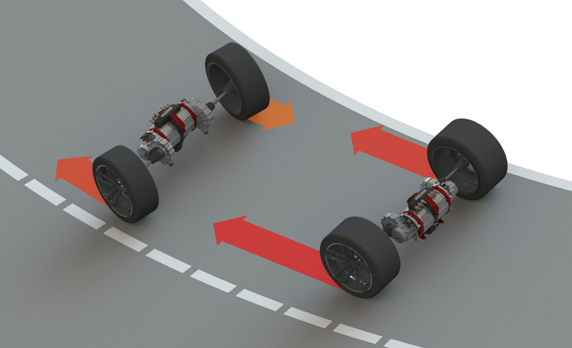扭矩矢量控在弯道优势很明显,毕竟通过控制左右两个车轮的扭矩差,实现扭矩转向。燃油车又是加分动器又是加差速器,还要做很复杂的电控离合器,才能做到的功能,电动车两个电机就摆平了。