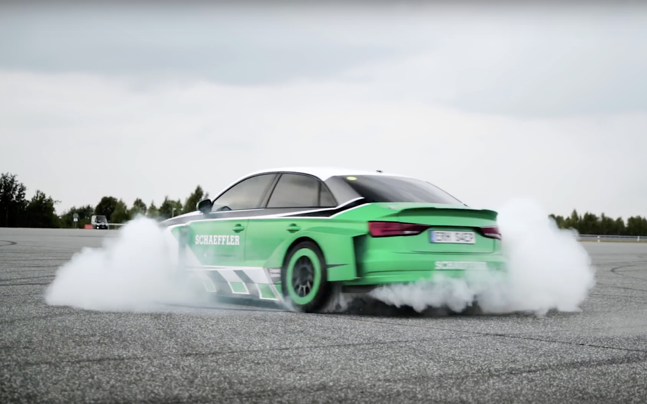 如果电动车疯狂一点,四个轮胎各配一个电机,那功能就更夸张了,比如奥迪RS 3 LMS,人家原地掉头要5-6米,它原地漂移360度就完事了。
