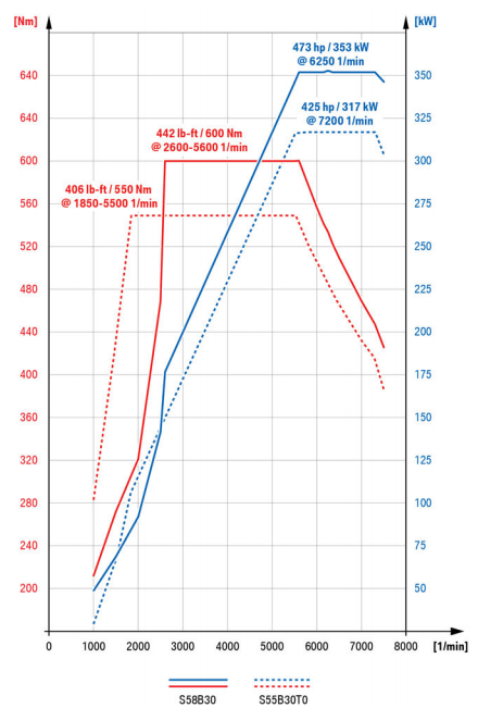以宝马S58发动机为例,它的动力输出已经输出很炸裂,最大扭矩600N·m,输出区间1850-5500rpm,这在汽油发动机中已经是顶尖水平,但跟电机对比那就尴尬了!